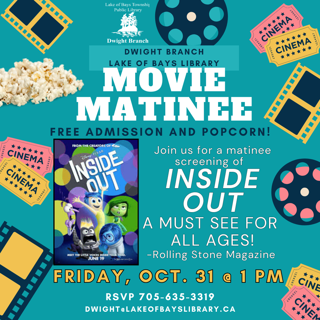 Join at Lake of Bays Library, Dwight Branch, for our Monthly Friday Movie Matinee on Friday, October 31 at 1 pm. This month we will watch Inside Out.