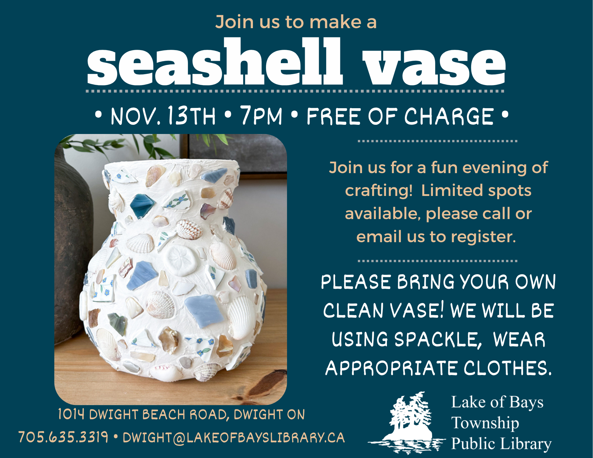 Join us for a fun evening of crafting, decorating a vase with seashells. Please bring your own clean vase! Glass or ceramic is recommended, with a mostly smooth surface. We will be using spackle to attach the shells, so please wear appropriate...
