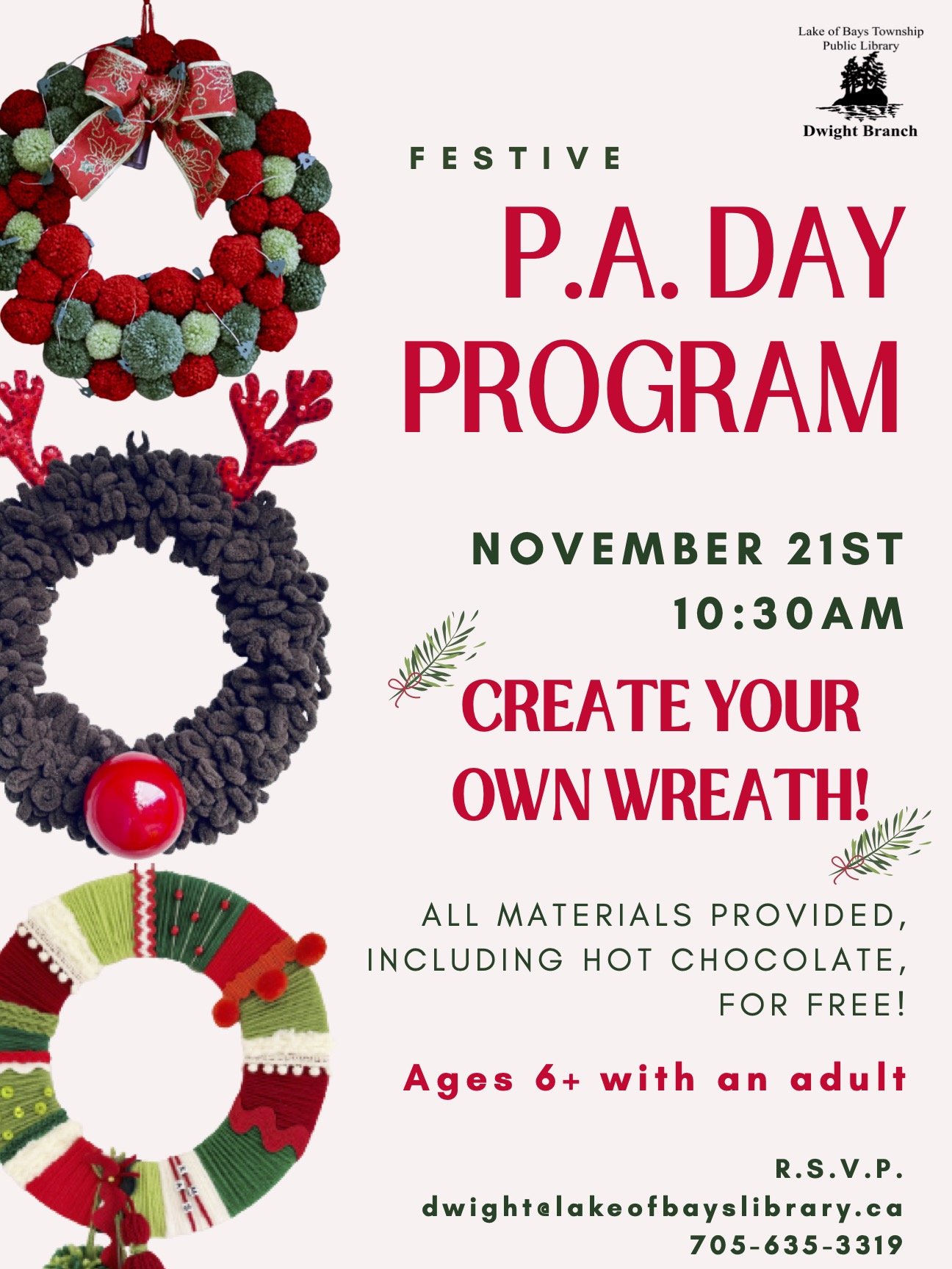 How are you spending your P.A. Day on November 21st? Join us at 10:30 am to create your very own unique wreath using a variety of provided materials. Hot chocolate will be served and the cost is free! This program is for children ages 6+ with an...